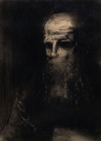 Le vieillard représenté au fusain évoque très certainement Bresdin, le maître de Redon dont un portrait réalisé au crayon se situe au Louvre.La nature même de l'éclairage du captif est inconnue du spectateur, mais la figure, plongée dans l'obscurité, apparaît avec un front violemment éclairé, des orbites noires et une barbe masquant sa bouche. L'homme semble aveugle et emmuré dans un silence. Les maillons de la chaîne sur son bras accentuent cet emprisonnement nous renvoyant ainsi à une solitude extrême, existentielle.