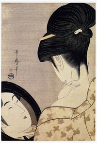 8. Sur une suggestion de Mme Vauzou, professeur d'Arts Appliqués, les élèves ont ensuite reconstitué le tracé d'une courtisane japonaise se regardant dans un miroir à partir d'une estampe de Kitagawa UTAMARO, un peintre japonais du 18e siècle. Sur ce tracé, les élèves ont reproduit en CALLIGRAMMES la géographie intérieure de leur autoportrait complexe.