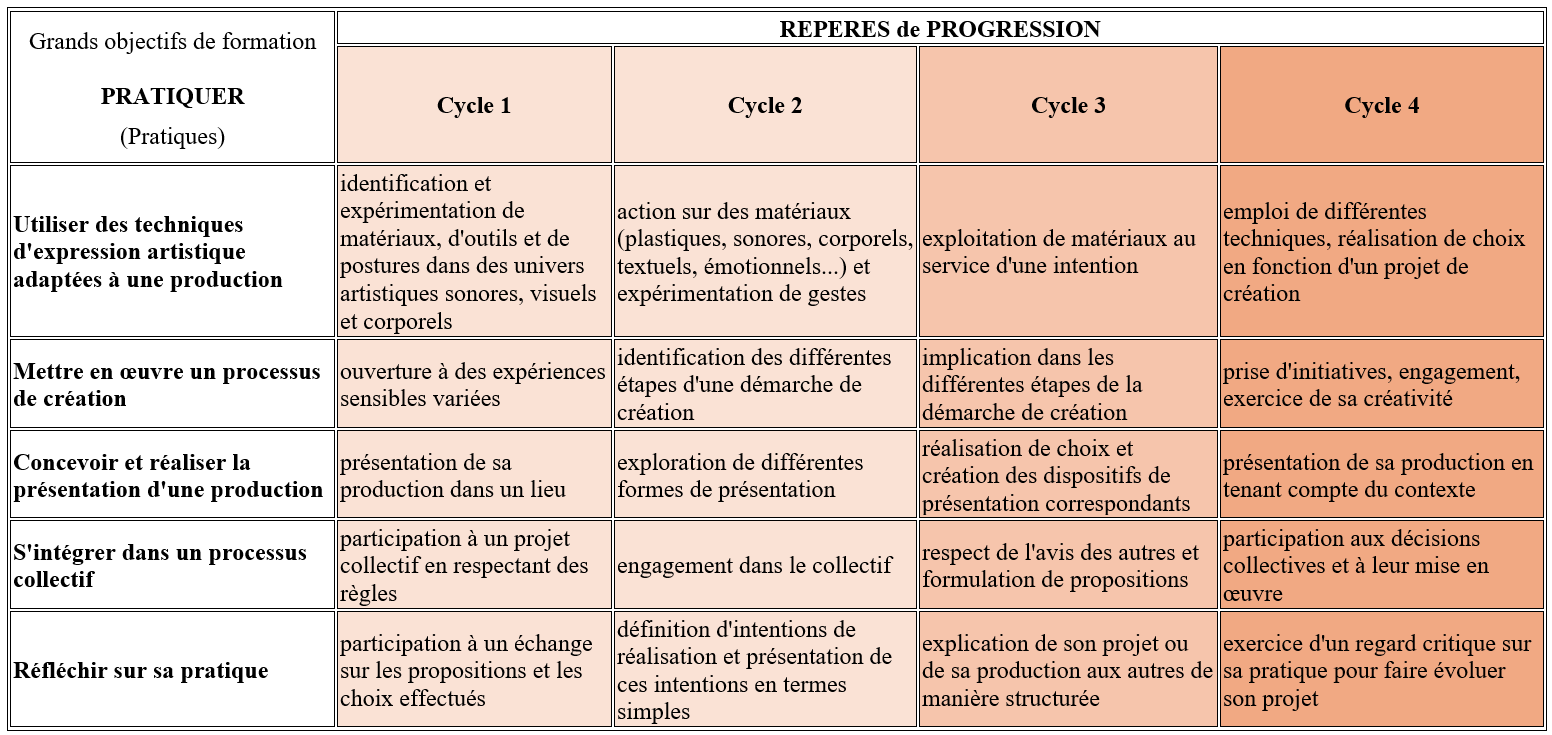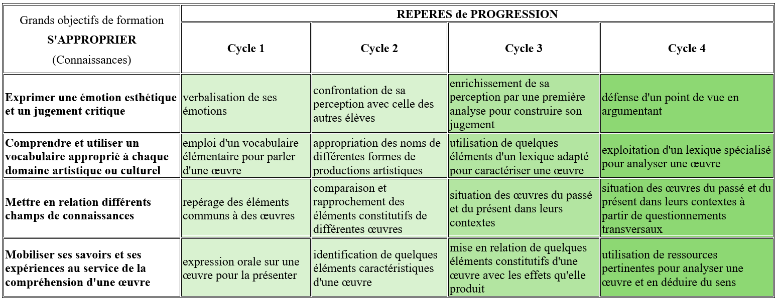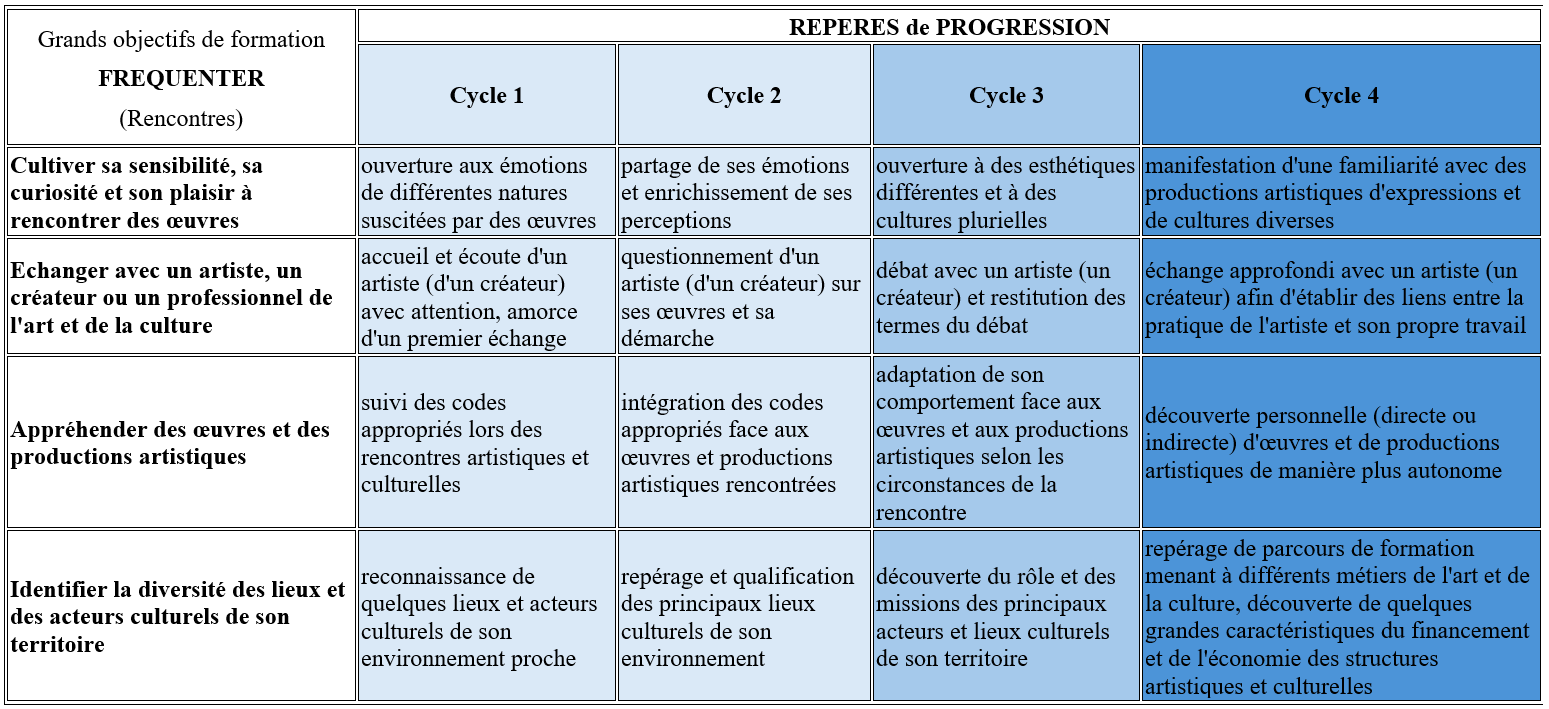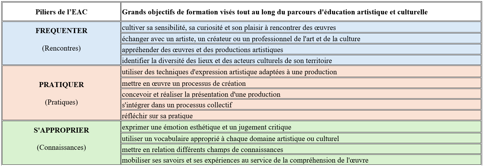 Le tableau suivant présente les grands objectifs de formation visés durant tout le parcours pour chaque pilier de l'éducation artistique et culturelle et en lien avec le référentiel de 2015. Ces piliers indissociables sont transcrits sous forme de verbes, du point de vue des actions de l'élève : fréquenter, pratiquer, s'approprier