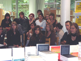 Un peu de solennité pour cet événement : discours de Monsieur le Proviseur, équipe pédagogique et éducative invitée (4 professeurs de disciplines variées étaient présents ainsi qu'une assistante d'éducation), 3 journalistes (Ouest-France, Presse-Océan, une radio locale). Présentation des livres par Madame Bittman, la responsable communication de la FNAC de Nantes, avant la ruée sur les ouvrages...et conclusion par un pot pour les élèves. (re-photos, on pense toujours au journal de bord ).