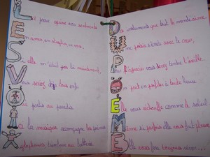 Chaque élève a dû réaliser une anthologie. Le support était simple : une feuille canson couleur A4 pour la couverture et 5 feuilles A4 pour les pages intérieures de l'anthologie (chacune pliée en deux afin de faire un petit livret) dans lesquelles ils ont créé ou reproduit des poèmes de différentes formes.