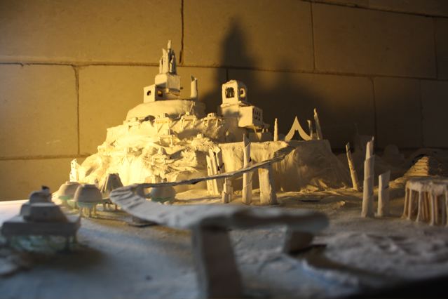 Les élèves avaient également travaillé sur la question de la cité (réelle ou imaginaire) : perspectives, maquettes d'architecture, machines « léonardesques » constituées de matériaux de récupération (visibles également à l'extérieur dans la cour Saint Benoît) contribuant ainsi à une réflexion sur notre environnement. La notion d'enfermement comme machine à produire des imaginaires était évoquée par une grande installation de tissus et de portraits peints, sorte de tour de Babel accrochée sous les poutres du grand Dortoir.