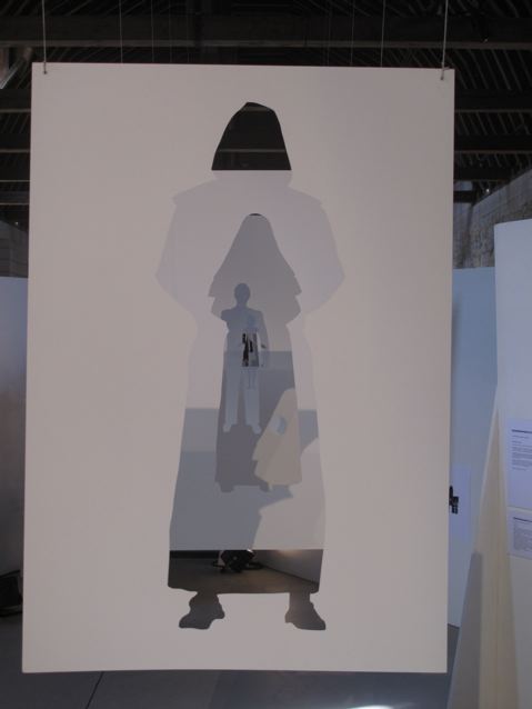 Les silhouettes sont de plus en plus petites pour que le spectateur, se plaçant devant le premier panneau suspendu, puisse voir les autres à travers. Sur le dernier panneau, il y un petit miroir, ainsi le spectateur cherche à se voir. Il se voit. Il représente l'ensemble des gens qui occupent l'Abbaye au moment présent. Il prend ainsi conscience qu'il fait partie de l'histoire de ce lieu.