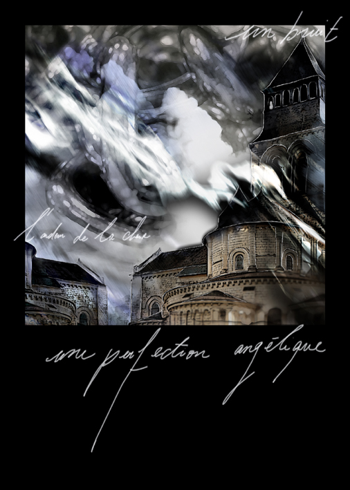 Nos images numériques sont issues, entre autres manipulations, de la superposition de plusieurs photographies du lieu et de divers objets (chaîne, volet, chapelet) symbolisant à la fois la réclusion et la dévotion. Les mots, permettant d'articuler les trois images, sont extraits d'une lettre écrite au XIe siècle par Geoffroy, abbé du monastère de la Trinité de Vendôme, au fondateur de l'abbaye de Fontevraud, Robert d'Arbrissel.