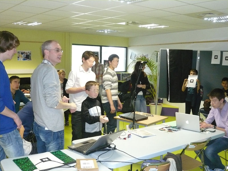 L'atelier proposé à la Fête de la Science sera encadré du point de vue Réalité Augmentée par les élèves de l'année dernière. Il s'agit de présenter la technique de la réalité augmentée où le public sera invité à réaliser un TAG personnel sous la forme d'un simple dessin. Cette empreinte sera numérisée afin que le fichier associé puisse être reconnu dans le flux vidéo d'une scène filmée. La reconnaissance du TAG génèrera l'incrustation d'un objet 3D virtuel dans la projection vidéo mise en oeuvre. Enfin chaque auteur d'empreinte [ou TAG pour la discipline] pourra déplacer son 'dessin' face à la caméra et par ce mouvement moduler les composantes rouge, vert et bleu d'un projecteur de scène. Un vidéoprojecteur témoignera de cette expérience de réalité enrichie par la capacité à moduler une énergie [thème de l'année] par le simple déplacement d'une oeuvre d'art [TAG]. Le surcoût de cette augmentation de réalité sera donc limité à la valeur faciale du dessin.