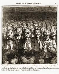 Honoré Daumier a réalisé de nombreuses caricatures de publics de théâtre du XIXème siècle, des bourgeois repus du parterre, au public bruyant du "paradis", ou de la "poulaille". Il a croqué les spectateurs de tragédies comme ceux du "boulevard du crime" et ces documents (qu'on peut trouver par exemple dans le livre "Les gens du spectacle", éditions Trinckvel) nous offrent une occasion de jouer avec la notion de spectateur. On propose aux élèves de réaliser l'image fixe d'une de ces caricatures et d'inventer la réplique que chacun des personnages pourrait dire. On se montre ensuite ces images avec profération des répliques.
