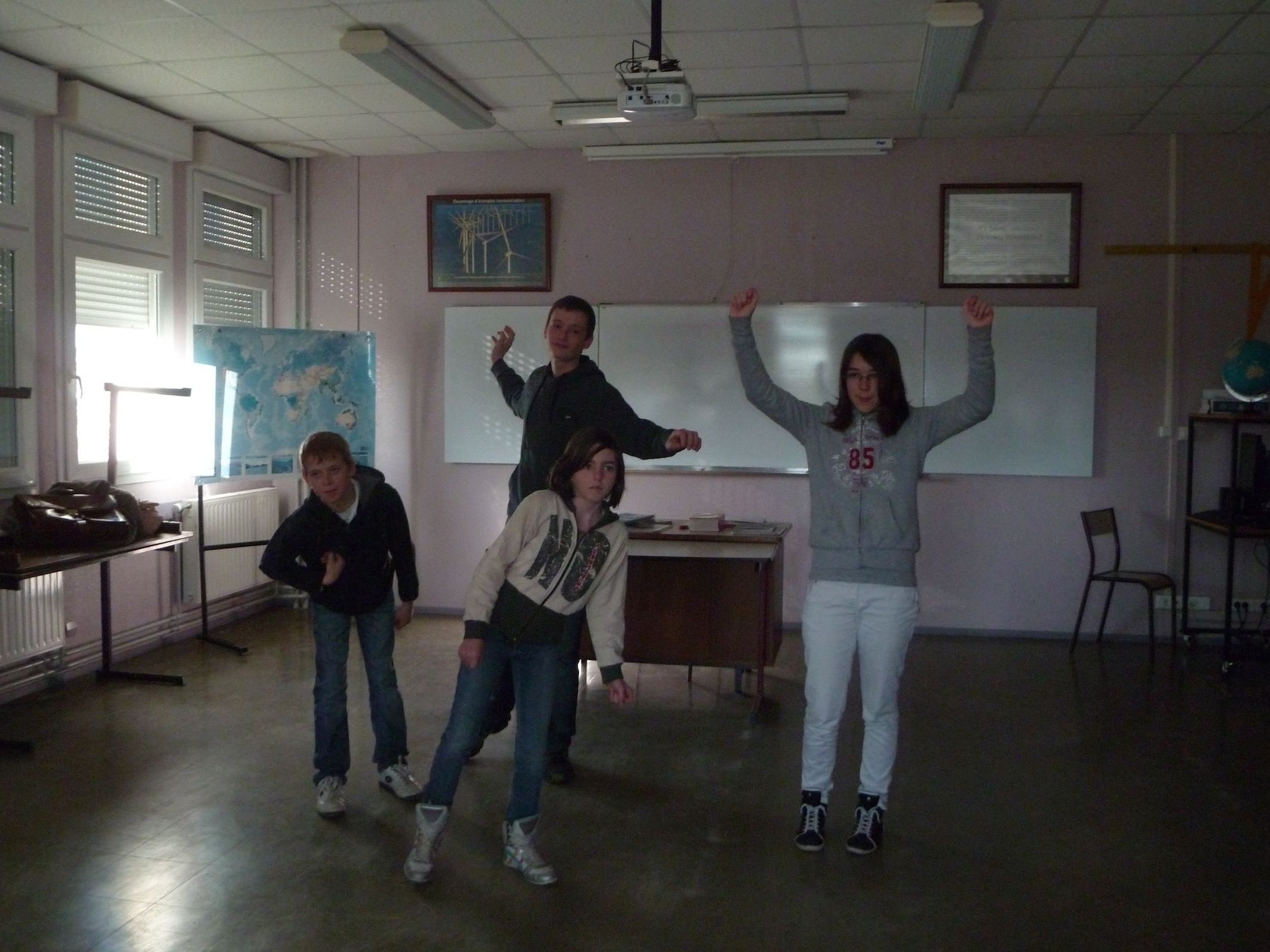 - Les émotions : derrière le rideau noir, au signal, se lever, le rideau cachant le corps, "faire" la tête correspondant à l'émotion : joie, déception, colère, etc.