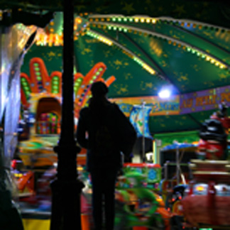 Silhouette qui regarde Le tourbillon de l'enfance. Silhouette qui regarde Le rire et la lumière Le bruit et l'ivresse. Silhouette qui regarde Les tentacules de l'éventail L'étourdissement, l'éblouissement. Silhouette qui regarde La solitude. Mylène Immobile devant ce tourbillon, Ces bateaux qui les entraînent, Dans l'ombre, bloquée sous ses tentacules, Elle les voit, eux. Plein de rire et de lumière, Un pilier pour la soutenir, Vertige de la solitude, Vide, emplie de bruit, Ces bateaux qui les entraînent, Elle ici, eux, là-bas Cécile Nostalgie Les lumières pétillantes l'éblouissaient Ses larmes brillaient de loin Le flou bariolé du « Petit Poucet » la rendait Ivre Ivre de cette enfance perdue Ivre de cette adolescence à venir Ivre de solitude La musique lancinante Rendit peu à peu à Irène Son sourire, sa légèreté, Sa fraîcheur Sylvaine Bordant la lumiere, dans la solitude d'un souvenir ivre, elle regarde le tourbillon de son enfance. Sous les tentacules de lumière floue, la silhouette d'un bateau bariolé, comme un rire pétillant - trop fort - a quelque chose d'étourdissant. Qu'a-t-elle laissé là-bas ? Olivier Je regarde une silhouette dans la lumière bariolée du manège, Éblouie par l'éventail tourbillonnant des loupiotes, Je me souviens du bruit, des rires, de l'étourdissement et de l'ivresse de mon enfance. Là-bas, mon enfance... Bérengère |