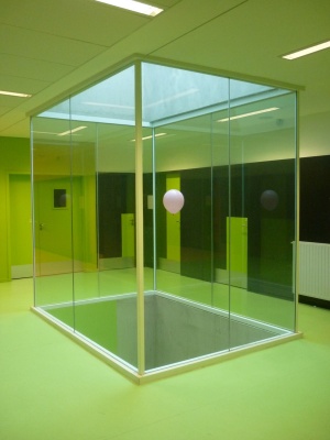 Le ballon rose dans son aquarium vert ou comment un ballon gonflable dialogue avec l'architecture du collège. Ce ballon sert aussi de signalétique, dessous, à l'étage inférieur, se situe l'entrée de l'exposition.