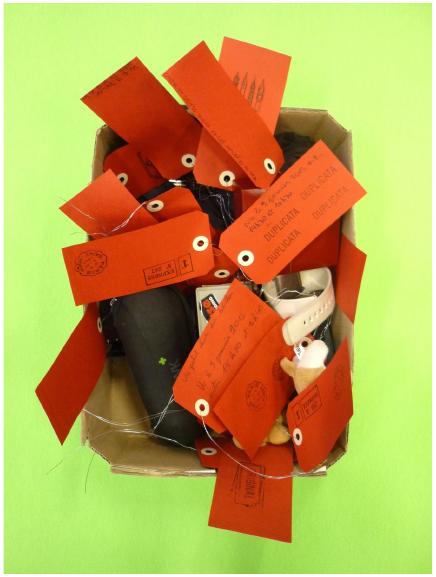 Chaque élève s'est choisi un objet trouvé et y a attaché une étiquette américaine avec dessus une description et l'heure à laquelle celui-ci a été pris en charge par l'élève. Il s'agissait ensuite d'écrire un scénario, transformant le statut de l'objet qui de simple objet trouvé devient le point de départ d'une fiction. Photographiés ensuite sur fonds colorés, ils sont mis en valeur en vue d'une exposition des images et des textes et d'une micro-auto-édition.