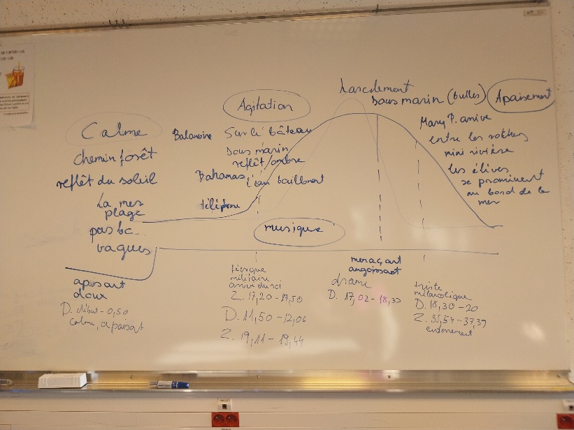 Lors de la dernière séance, toutes les musiques, bruitages et haïkus ont été compilés. Les élèves ont pu ainsi annoter le photogramme afin de faire apparaitre pour chaque plan ce qu’ils voulaient faire entendre.