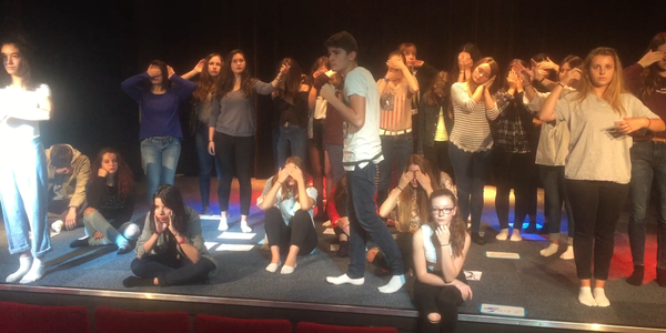 9) On imagine alors une petite forme qui rendrait compte à la fois du spectacle et des différents éléments de restitution qu’on a fait émerger, et aboutirait à un tableau collectif, « cadeau » de la 1L2 à l’équipe artistique du spectacle. Après plusieurs tentatives, le résultat est filmé et sera envoyé au Grand T et à l’équipe artistique .