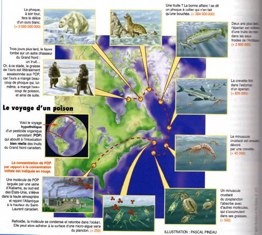 - la polémique autour du gaucho et de ses conséquences sur les abeilles - la bioconcentration de la dieldrine chez les oiseaux de mer - la bioconcentration du DDT dans la chaîne alimentaire des Inuits