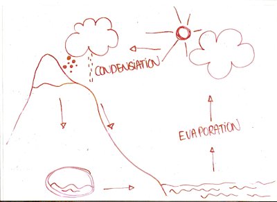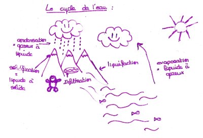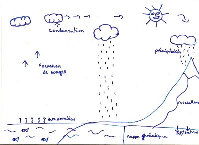Recherche préliminaire et état des lieux. Une recherche d'une demi-heure permet de rappeler aux élèves le cycle de l'eau.Pour cela les élèves sont invités, par groupes de deux, à proposer sur transparent un schéma du cycle de l'eau. Au bout d'une dizaine de minutes