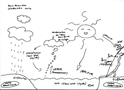 Deux ou trois binômes présentent alors "leur cycle de l'eau " à la classe. Ceci engendre échanges et discussions avec la classe et permet d'enrichir les schémas des termes oubliés. Une synthèse est proposée par les enseignants sous forme d'un schéma non légendé distribué aux élèves, schéma qu'ils devront compléter en puisant dans les apports issus des échanges précédents.