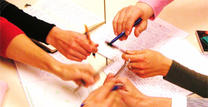 Mon écrivain/poète intervient une semaine sur deux. En termes d'organisation et de travail, mener un atelier avec des élèves demande beaucoup d'investissement. J'ai fait le choix de privilégier au maximum le temps d'écriture à proprement parler. Autrement dit, je me charge seule de la saisie des textes. Les élèves volontaires peuvent de temps à autre me donner un coup de main pendant leur temps libre. De plus, j'ai aussi fait le choix de ne m'atteler à la mise en forme de leur recueil qu'une fois la présentation publique réalisée. En effet, j'ai souvent l'impression d'être totalement submergée en fin d'année. Je préfère me donner du temps pendant les vacances.