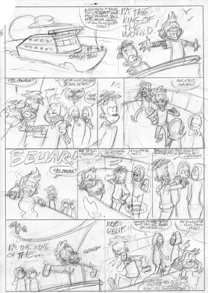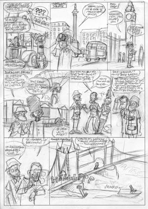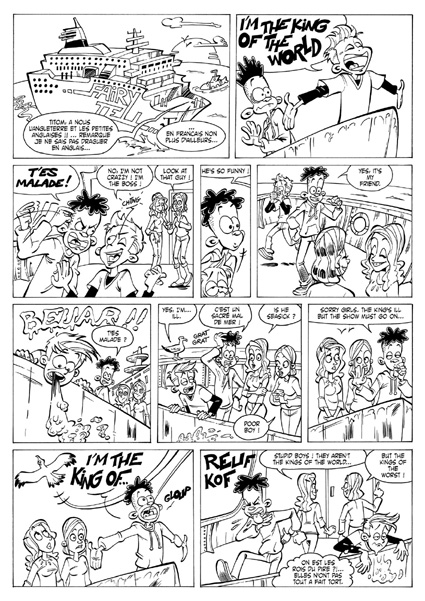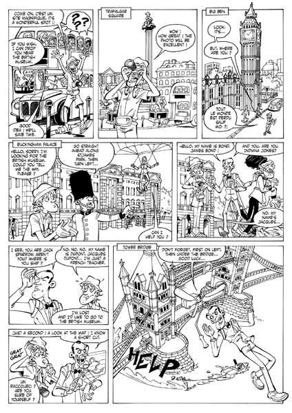 Le passage à la douane n'est pas le plus facile pour des novices en anglais. En revanche, les élèves apprécient la découverte du ferry et passent une nuit peu reposante. Tom et Yann, nos deux héros, en profitent pour tenter une conquête anglaise et féminine. Un élève, peu enclin à la compréhension des horaires, n'aura pas la chance du voyage en bateau puisqu'il a raté le départ : ce retardataire viendra en avion et se plaindra d'être le bouffon de l'histoire. À l'arrivée en Angleterre, les premières impressions comme la découverte des familles d'accueil oscillent entre préjugés, étonnements et surprises cocasses : se présenter, découvrir les intérieurs anglais, savourer un dîner british peuvent s'avérer de savoureux moments. Le lendemain matin, le réveil est difficile pour Tom. Pour le prof de français, qui pourrait passer pour un aventurier, il est en revanche facile de se perdre dans Londres ; heureusement, James Bond survient pour le remettre sur le chemin. Les visites des sites incontournables en séjour anglais sont propices à des saynètes humoristiques, voire décalées : le British museum, Bucking Palace, Big Ben, La tour de Londres et les Joyaux de la couronne... L'Histoire a sa part d'aventures (avec le fantôme d'un chevalier anglais, Jack l'éventreur...), la littérature et le cinéma offrent des clins d'œil (Mister Bean, James Bond, A. Christie, Sherlock Holmes et une planche sur Shakespeare...), la musique anglaise permet également des références culturelles (les Beatles, Pink Floyd...) La simple vie quotidienne est propice à de savoureuses scènes (petit-déjeuner, vidéosurveillance, supporter anglais...) Sans oublier les classiques du séjour à l'étranger avec l'école (passage par l'hôpital, match de foot prof-élève et la photo de classe...) Mais il faut reprendre le chemin du retour et montrer aux parents tous les cadeaux et bienfaits d'un voyage à l'étranger. Mais aussi tous les changements de personnalités... Vous pouvez télécharger le projet de "chemin de fer" de la bande dessinée et des exemples du travail effectué autour de la traduction.