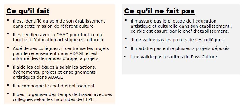 - participant à l'élaboration du volet culturel du projet d'établissement en lien avec le conseil pédagogique et le conseil des délégués pour la vie lycéenne ou collégienne ;