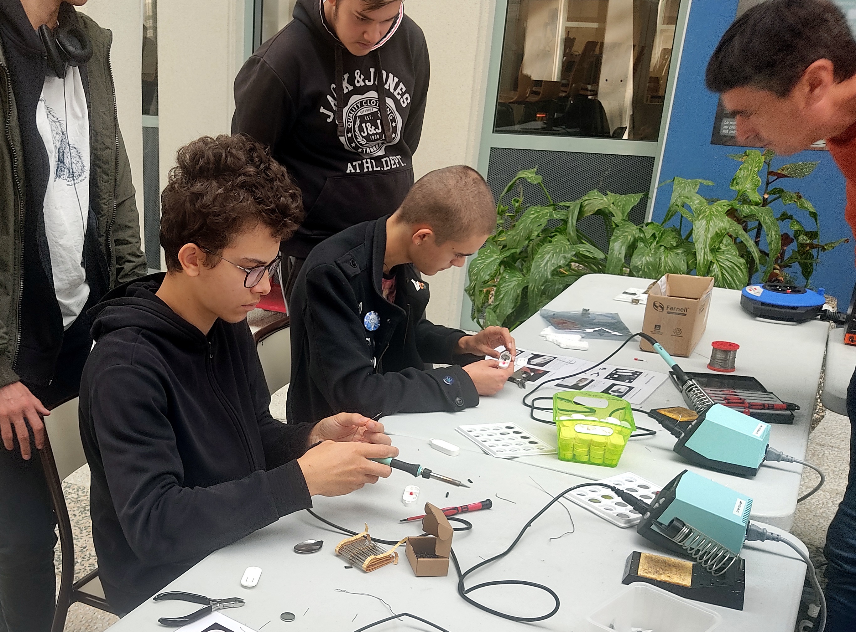 Les élèves interagissent avec le public sur le stand du lycée Livet. Ils participent également à l'animation du stand de l'IETR où un atelier de soudure de composants électroniques est proposé.