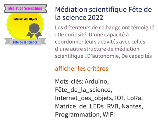 Un Open Badge a été émis à l'occasion de cette action à destination des acteurs de ce projet. Il s'agit de valoriser les compétences informelles mobilisées dans le village des sciences par les élèves.
