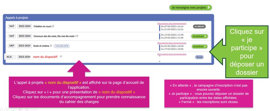 L'image ci-dessous présente comment répondre à un appel à projet à partir de la page d'accueil.