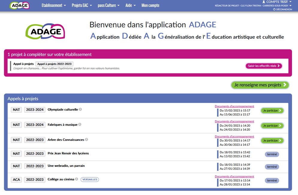 renseigner des projets sur Adage lors d'une campagne d'appels à projets