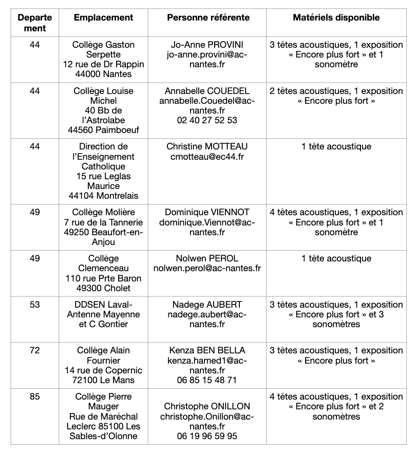 L'Académie de Nantes est doté de plusieurs années de divers matériels pouvant être utilisés pour compléter un travail autour de la prévention des risques auditifs lors de séquences pédagogiques mélangeant plusieurs disciplines comme la SVT, la Technologie, les Sciences Physiques, l'Education Musical.... Chaque enseignant peut, en utilisant la procédure ci dessous, prendre contact avec les personnes ressources sur chaque département pour emprunter une tête acoustique, l'exposition "Encore plus fort".