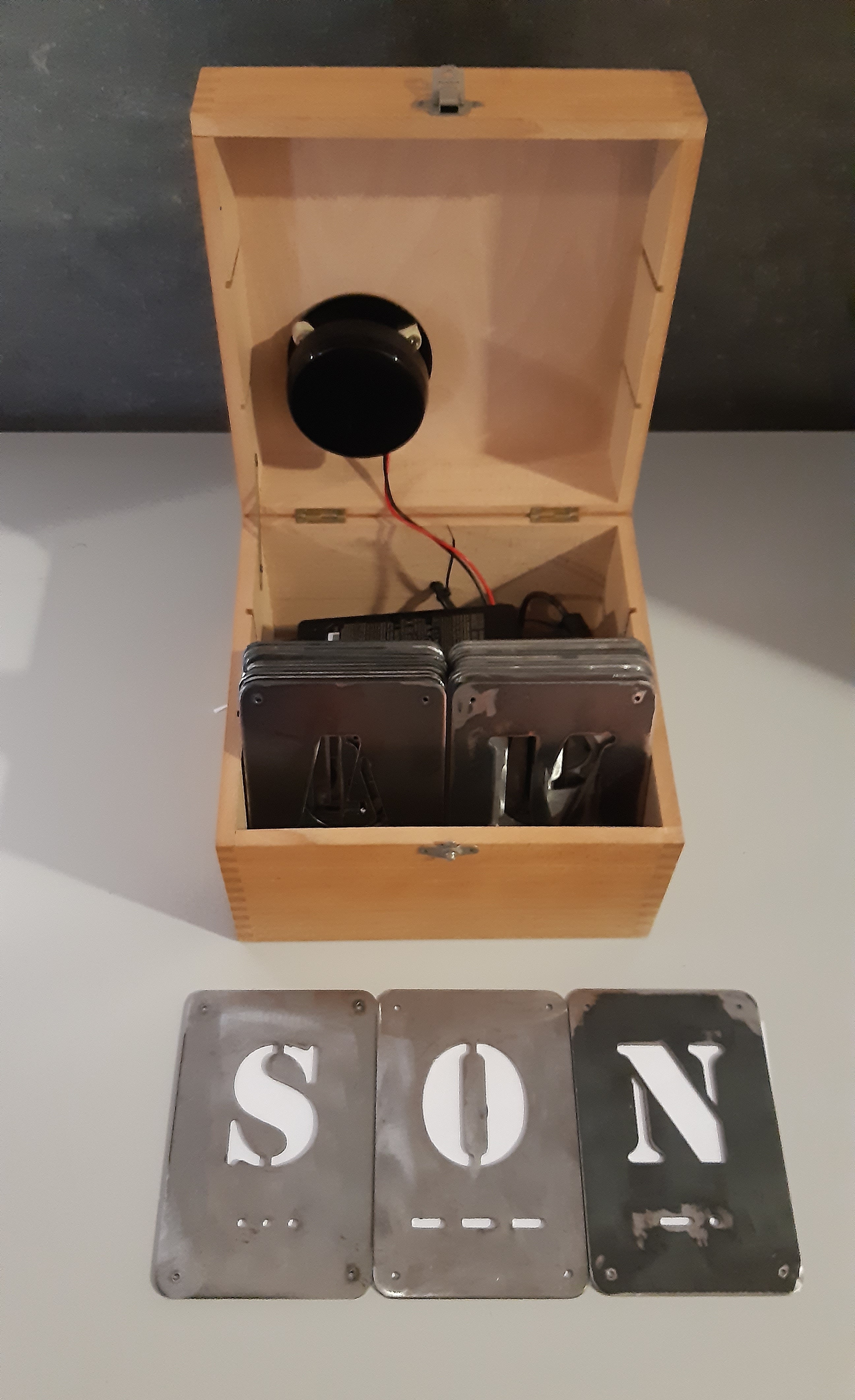 Nous avons passé une commande à la formation chaudronnerie du lycée Môquet Lenoir. La classe de seconde section chaudronerie a fabriqué un alphabet en acier à partir de l'alphabet latin et du morse imaginé. Les lycéens ont aussi construit plusieurs disques de la dimension d'un 33 tours autour desquels ils ont découpé dans l'acier pour former 3 mots en morse: écoutez, attendre, entendre. Ils sont présentés sur une tourne disque en marche qui, part son mouvement, rend illisible et silencieuse la lecture.