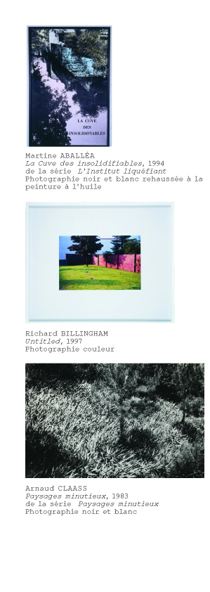 L’artiste rend compte du milieu qui l’environne en livrant des images personnelles, subjectives et parfois même autobiographiques. L’artiste Richard Billingham présente les zones périurbaines dans lesquelles il a grandit. Il fait son entrée dans le milieu de l’art avec notamment la publication en 1996 d’un livre réunissant des photographies qui déroulent la vie quotidienne d’une famille britannique particulièrement démunie, la famille de l’artiste. L’œuvre présentée ici est une vue de son quartier. Sagement encadrée de blanc, elle se présente comme une photographie de paysage urbain, mais la perspective est arrêtée par le pignon d’une maison. Les artistes contemporains offrent une vision du monde, mais aussi en proposent une possible expérimentation. Martine Aballéa invite le spectateur à rentrer dans l’œuvre pour habiter un territoire. L’Institut liquéfiant de Martine Aballéa fait partie d’une série de six photographies en noir et blanc rehaussées à la peinture à l’huile. Martine Aballéa donne à voir et plus encore à imaginer un improbable institut qui évoque les centres de cures. Aux frontières du réel et de la fiction, le spectateur est invité à confronter ses désirs et rêveries à ce décor désuet au charme ambigu, à expérimenter cet énigmatique établissement dressé en pleine nature qui on ne sait s’il apportera du mieux être ou si, au contraire, il n’a d’autre but que de nous faire disparaître.