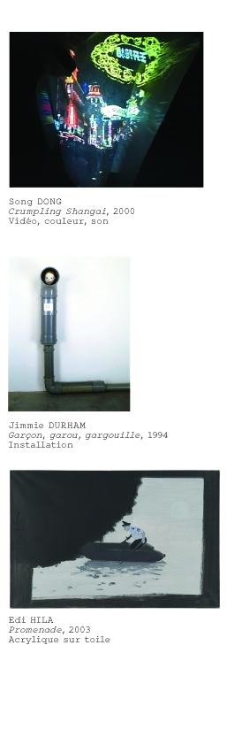 Dans la peinture intitulée Promenade de Edi Hila, un personnage debout dans un bateau pneumatique s’approche d’une tache noire. Que cherche t’il ? Va t’il disparaître ? Prenant la forme d’un tuyau où s’est dissimulée une figurine qui semble apeurée, la sculpture Garçon, garou, gargouille, de Jimmie Durham en réfère à l’inconvénient d’exister lorsque naissance ou destin vous condamne à n’être de nulle part. Autant d’allégories de la quête d’un territoire où vivre libre.