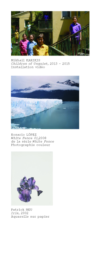 Les voyages dans des régions lointaines tout comme l’observation des environnements naturels proches permettent aux artistes d’exprimer leur sens artistique. Lors de ses explorations dans différents pays, Rosario Lopez expérimente des paysages et s’intéresse, à partir de leur observation, aux structures qui y sont cachées. Préoccupée par la limite, la frontière, sorte d’entité oscillant entre la mobilité et l’incertitude, elle photographie en 2008 le Glacier Perito Moreno situé à Calafate, en Patagonie argentine. Un mur de glace se dresse comme une frontière au sein de la nature. Le photographe Arnaud Claass fait de l’urbanité américaine et européenne son champ d’expérience, pour ensuite aborder les paysages, les arbres, les prés, l’eau… . Avec la série Paysages minutieux, l’artiste propose un apprentissage de la contemplation. Jouant de la fragilité des éléments naturels, Patrick Neu peint à l’aquarelle un délicat Iris aux pétales majestueux.