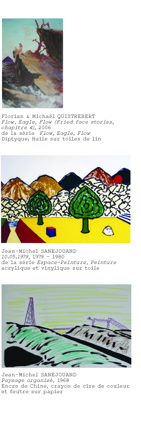 Alors que certains portent leur regard sur un paysage dénué de présence humaine d’autres artistes empruntent leur démarche au romantisme et au symbolisme, courants où le traitement du paysage illustre la relation de l’homme à la nature. La série Fried Face Stories signée Michael et Florian Quistrebert reprend les codes traditionnels de l’huile sur toile. Dans l’œuvre présentée, un personnage anti-héros erre dans un relief escarpé. Si Les frères Quistrebert font référence au paysage romantique et métaphysique du XIX e siècle avec une attirance pour les éléments sauvages et incontrôlables de la nature, ils y ajoutent leur goût personnel. La collaboration de Florian et Michael Quistrebert depuis 2002 génère un univers graphique où la concentration des références (musicales, cinématographiques, folks et académiques) innerve des séquences narratives ouvertes.