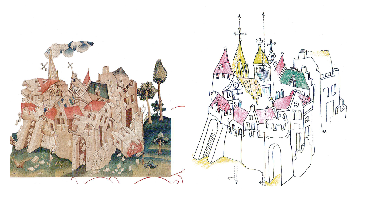 On peut analyser leur site, leur architecture, leurs multiples éléments constructifs. Les édifices civils ou religieux sont clairement visibles, parfois avec des détails d'une précision remarquable tels que la charpente, les herses, les volets, les ardoises des toits et les fenestrages.