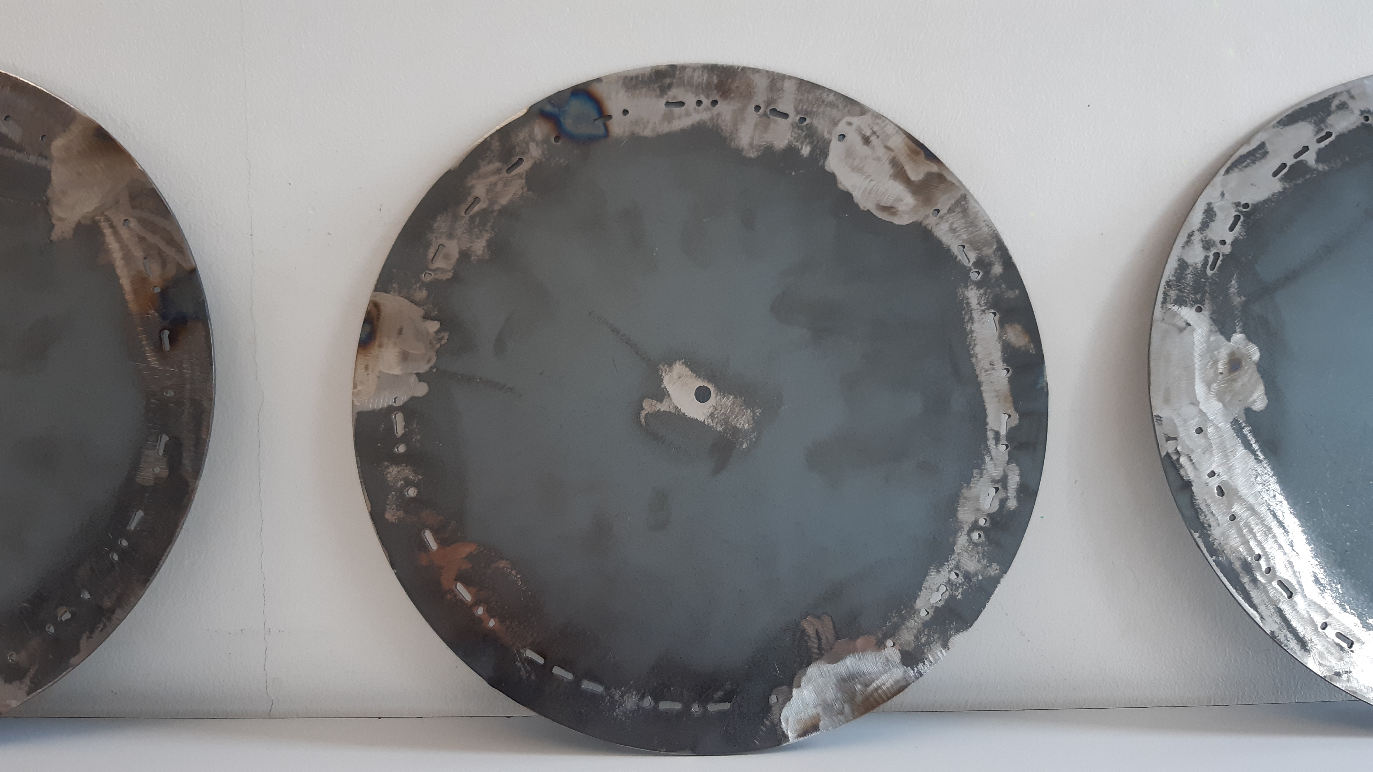 Lors de notre première rencontre avec lui, nous avons pensé au thème des 5 sens. En effet, nous nous sommes questionnés sur l'accès aux 5 sens des personnes en situation de handicap, cause pour laquelle nous sommes sensibilisés. Une fois le projet défini ensemble, Dominique Blais a pensé et imaginé un dispositif. Nous avons passé une commande à la formation chaudronnerie du lycée Môquet Lenoir. La classe de seconde section chaudronerie a fabriqué un alphabet en acier à partir de l'alphabet latin et du morse imaginé. Les lycéens ont aussi construit plusieurs disques de la dimension d'un 33 tours autour desquels ils ont découpé dans l'acier pour former 3 mots en morse: écoutez, attendre, entendre. Ils sont présentés sur une tourne disque en marche qui, part son mouvement, rend illisible et silencieuse la lecture.