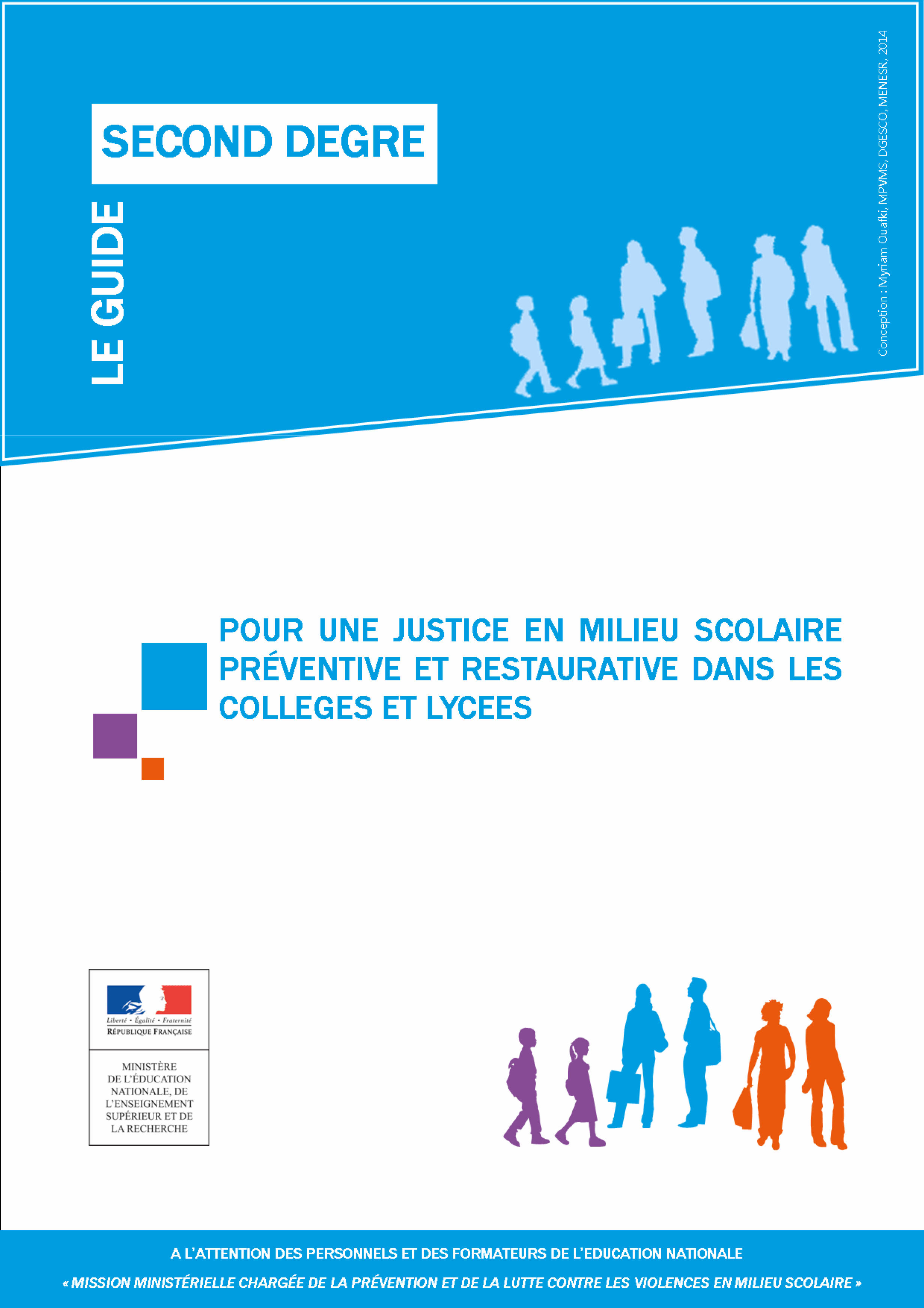 Ce guide, à l’usage du personnel scolaire des collèges et des lycées et de leurs formateurs, s’appuie sur un certain nombre de prescriptions règlementaires, de réflexions issues de l’expérience de terrain des personnels de l’Education nationale dans les établissements, des parents d’élève et des partenaires, ainsi que sur les apports de la recherche en sciences de l’éducation. L’objectif visé est celui de développer une approche plurielle de la justice en milieu scolaire, en abordant des pistes de réflexion et d’action participant à la co-construction et la refondation . Guide pour une justice scolaire préventive et restaurative dans les établissements scolaires du second degré 4 d’une école juste, bientraitante, garante du respect des droits de chacun, propice au développement de l’enfant et du jeune ainsi qu’au bien-être de tous (élèves, personnels, parents). Il constitue un support permettant la mise en place et le maintien d’ « un cadre protecteur » pour tous les membres de la communauté scolaire : les enseignants et l’ensemble du personnel, les élèves, les parents d’élèves et les partenaires. Il s’agit d’offrir aux élèves les conditions pour développer les compétences sociales et civiques et l’acquisition d’un comportement juste, respectueux et responsable. La vie en milieu scolaire doit être l’occasion d’un apprentissage relatif à la vie en société de manière plus globale. La scolarité est un parcours d’apprentissage et d’expérimentation où nteragir de manière respectueuse et bienveillante envers les autres sans heurt ni violence est un apprentissage. C’est en aidant les élèves, en les encourageant, en les accompagnant par une approche bienveillante de la prévention et de la restauration des règles du vivre ensembleque cette noble mission de l’Education nationale peut s’ancrer sur le long terme, favoriser un bon climat scolaire et une société plus juste.