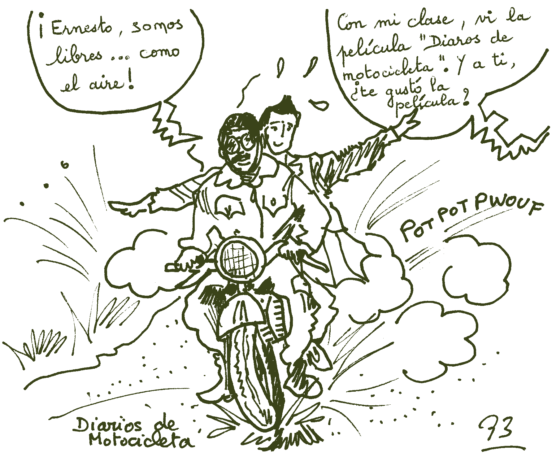Le projet oblige aussi et, ce n'est pas son moindre intérêt, à regarder l'actualité sous le regard de l'autre. On a déjà évoqué le cinéma avec Buñuel, mais les élèves ont eu d'autres occasions de parfaire cette acculturation cinématographique lors d'un temps fort connu sous le nom de Quinzaine du festival du film espagnol. Dans ce cadre, les élèves sont allés voir, en version originale, le film Diarios de motocicleta qui relate l'itinéraire de deux figures emblématiques de l'histoire récente de l'Amérique du Sud, Ernesto Guevara et Alberto Granada. Le travail en classe s'est, toujours dans les mêmes conditions, appuyé sur une connaissance géographique de l'itinéraire en même temps que sur un travail historique sur les circonstances de cet épisode révolutionnaire. Cet approfondissement s'est trouvé complété par une analyse précise des enjeux publicitaires de l'affiche du film. Pouvoir écrire à son correspondant sur ce film donnait encore plus de sens à cet apprentissage. C'est donc tout naturellement que les élèves ont pu, pour préparer leur dernier envoi, s'intéresser aussi au Festival de Cannes ou au tournoi de tennis de Roland-Garros en pensant à leurs correspondants espagnols. Beaucoup ont, à cette occasion, découvert le cinéaste Almodovar et son actrice fétiche Pénélope Cruz. D'ailleurs, on retrouve aussi la trace de cette lecture de l'actualité du point de vue français, cette fois, dans les lettres des espagnols. Dans leur dernier envoi, par exemple, ils accordent de la place à la visite en Espagne du couple présidentiel français.