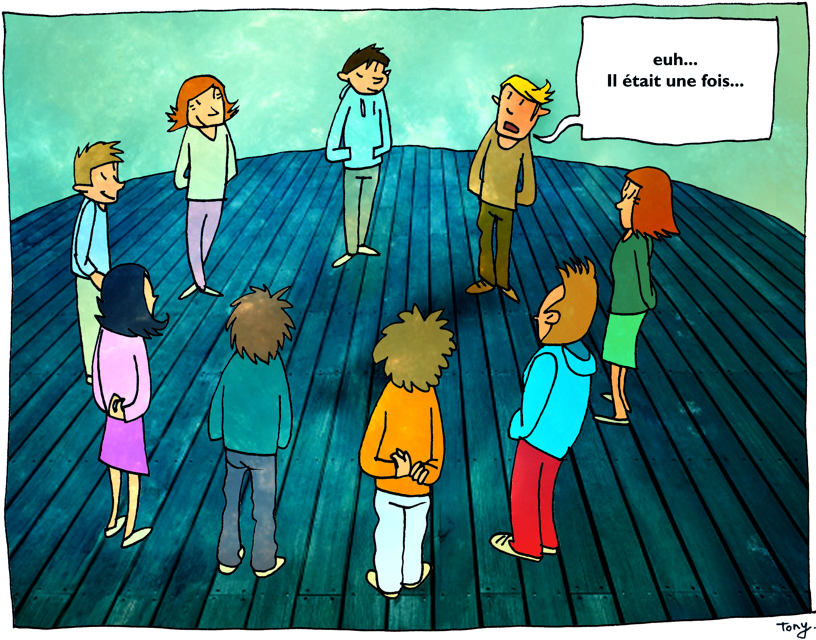 Dès que les élèves sont immergés dans l'univers du conte, l’enseignante et la conteuse vont leur demander, lors des séances d'AP ou en classe entière, de se mettre par groupes de trois ou quatre avec pour objectif de "raconter à leur tour un conte entendu, ou lu, avec leurs propres mots, c’est-à-dire de créer leur propre version du conte, version qui restera exclusivement orale et donc mouvante, évolutive, vivante". L'espace classe lui-même s'en trouve modifié puisque pour ces séances les tables sont poussées, il est permis de se déplacer, on travaille en cercle, afin que chacun "se retrouve à l’égalité", selon l’expression de Claire Guillermin. Selon les séances, les élèves vont travailler les dialogues entre les personnages, la précision de la narration, la visualisation des images du conte… Les adultes sont présents pour accompagner les élèves, Claire Guillermin intervient lors de ses venues notamment sur ce qui pose question ou difficulté selon les demandes en amont de l'enseignante. Les adultes ont aussi un rôle pour créer et consolider un cadre sécurisant autour de cinq règles discutées et adoptées ensemble au départ : la bienveillance, oser (obligation d’essayer), le droit à l’erreur, la discrétion et la coopération. Durant toute cette étape, les élèves n'écrivent rien, ils échangent, créent, transforment, s'exercent à raconter. Rien n'est figé, définitif, fini.