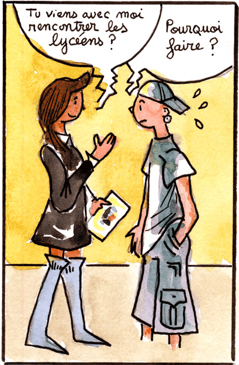Le collège Alain-Fournier du Mans, classé en réseau d’éducation prioritaire, s'est inscrit dans le projet. Vingt collégiens de troisième se déplacent au lycée une demi-journée au mois de mars. Le conseiller principal d'éducation les accueille. Présentation et visite de l'établissement sont au programme. La rencontre avec les élèves de seconde dure ensuite une heure trente ; elle constitue la dernière séance du module. Qu’est-ce qu’être lycéen ? A. Coué, principal-adjoint du collège Alain-Fournier, remarque que la verbalisation distanciée des élèves de seconde est la clé de la réussite de la rencontre. “Les vingt collégiens sortent stimulés et rassurés”, complète-t-il. La rencontre a lieu début mars, à un moment où la réflexion quant au choix d'orientation en lycée général et technologique, en lycée professionnel ou par l'apprentissage, approche. Mais tous les élèves de troisième ne peuvent assister à la rencontre. “La priorité aurait pu être donnée à ceux qui souhaitent aller en lycée général et technologique, mais nous avons décidé de proposer cette rencontre aux élèves encore hésitants, ceux qui ont besoin d'une aide pour faire mûrir leur réflexion, qui se demandent s'ils auront leur place au lycée ou même s'ils ont envie d'y aller. Il s'agit de leur donner confiance, qu'ils se sentent capables de franchir le pas”, poursuit le principal-adjoint. “Quel que soit le choix final de l'élève, la résonance des témoignages est importante”, précise A. Coué. Finalement, c’est un jeu de miroirs qui s’installe ; entre les étudiants et les lycéens, puis entre les lycéens et les collégiens. Les élèves réalisent que, quelle que soit l’étape de leur parcours d’orientation, ils partagent les mêmes peurs : perdre ses repères, manquer de temps, échouer ou ne pas être en phase avec ses aspirations.