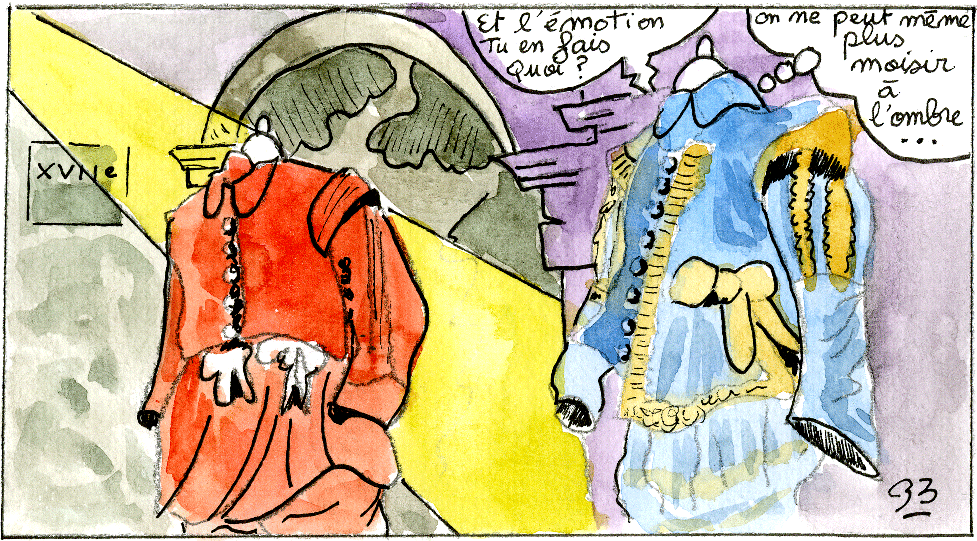 L'histoire du théâtre est abordée par une entrée particulière, celle de l'espace théâtral, de l'Antiquité à nos jours. Recherches personnelles suivies d'un court exposé auraient pu suffire, mais comment retrouver la spécificité du théâtre ? Après leurs recherches, les groupes avaient pour consigne de restituer, avec les moyens du bord, l'espace correspondant, et d'y jouer une scène d'une pièce de l'époque. Après les Grecs et les Romains (Électre de Sophocle et La Marmite de Plaute), on a vu une scène de Commedia sur tréteaux de foire, une scène de Roméo et Juliette sur une scène surélevée représentant le théâtre élisabéthain, Le Mariage de Figaro dans un théâtre à l'italienne - la forme est reconstituée au sol, ainsi que les baignoires, le parterre... puis l'espace contemporain, l'espace asiatique (théâtre Nô)... Ces présentations complètent leur visite du théâtre Paul-Scarron duMans, et la découverte des théâtres du département: le théâtre des Ursulines de Château-Gontier, le théâtre de Laval, le Petit Théâtre du Tiroir... Les dessins d'André Degaine apporteront les précisions et les détails nécessaires (Histoire du théâtre dessinée).