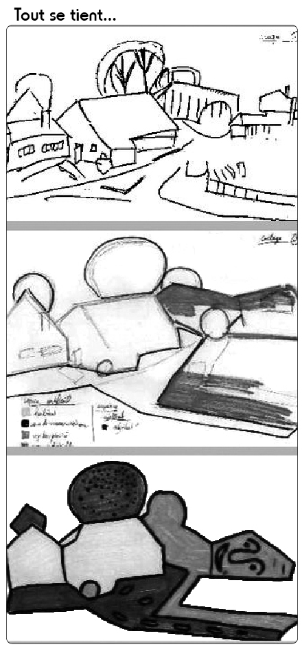 Or une observation "scientifique" demande une méthode de représentation et de lecture communes. Comment permettre la compréhension de cette schématisation nommée que constitue la carte ? L'utilisation de la photographie permet de matérialiser ce passage vers la conceptualisation. Une première photographie est proposée aux stagiaires qui désignent ce qu'ils y voient. Les différents éléments (maisons, champs, bois, route...) sont normés puis schématisés à l'aide de masses colorées différentes (voir ci-dessous). Ainsi, note Vincent Paré dans son compte rendu, "après avoir identifié et nommé (des mots sociaux aux mots du géographe) les objets géographiques, l'élève pourra repérer des unités paysagères spécifiques et les synthétiser dans un croquis légendé qui constitue un schéma explicatif de la réalité, mais pas la représentation de cette réalité". La mise en comparaison de ce schéma coloré et d'œuvres de Chaissac est éloquente. Le cloisonnement coloré de l'œuvre artistique répond au schéma géographique à la différence près, et elle est de taille, que l'artiste donne à l'espace une humanité, en le personnifiant, que le croquis n'a pas. Le schéma géographique, lui, donne le code normé de sa lecture par la légende. Il intellectualise ce que l'œuvre d'art exprime plastiquement. Il donne la clef d'une interprétation qui se veut accessible et sans ambiguïté. Il vise la compréhension commune tandis que l'œuvre d'art érige sa subjectivité et cherche à toucher d'autres sphères de compréhension, sensibles, esthétiques, plastiques.
