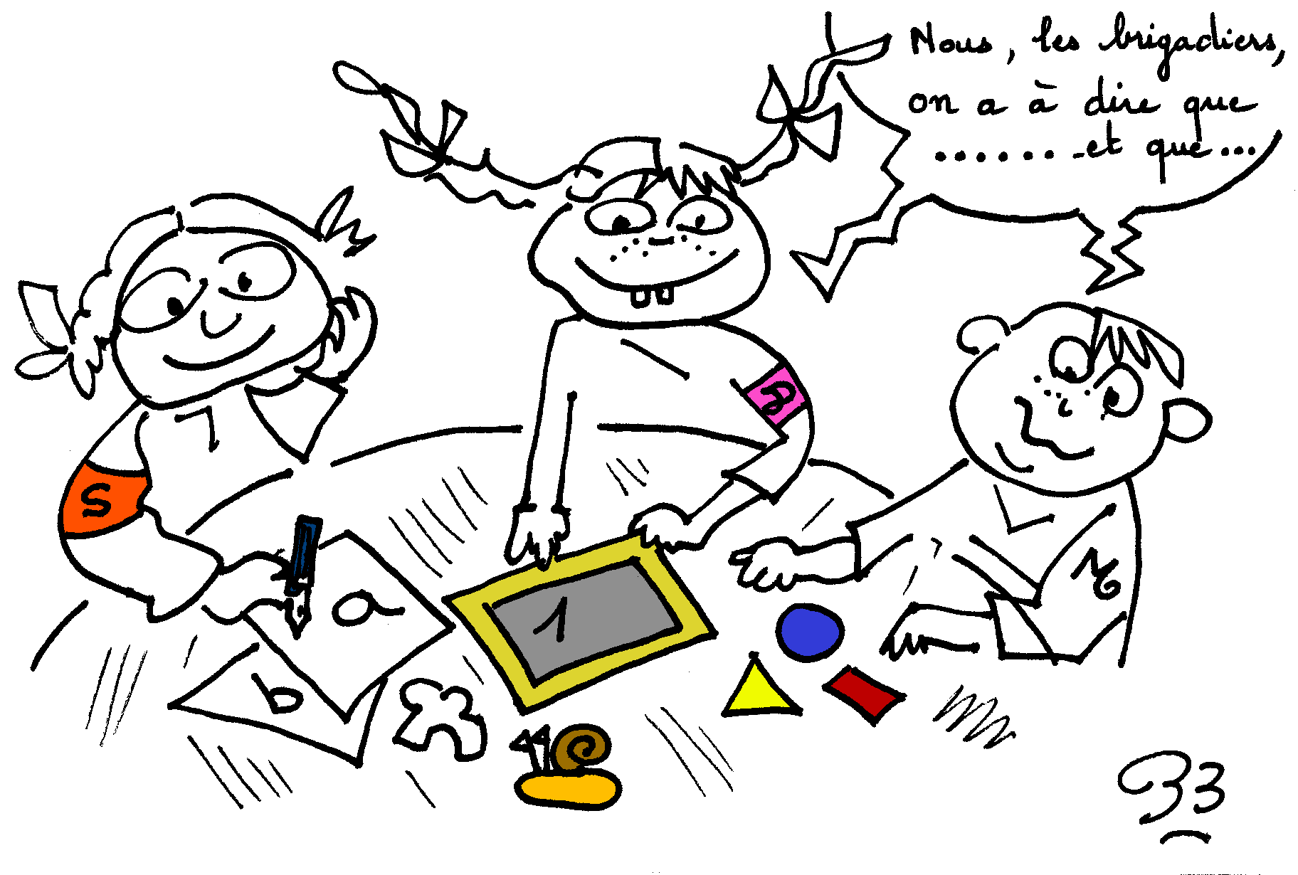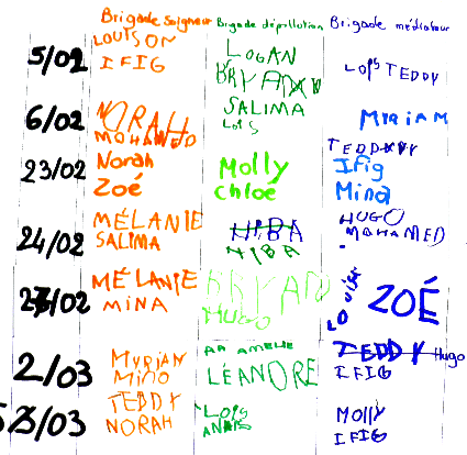 "Pour nous, le terme "brigade" évoque avant tout l'idée d'un groupe affecté à une tâche sur un territoire précis", précisent les deux enseignantes. Trois types de brigades de deux élèves chacune cohabitent à chaque récréation, sur la cour. Le matin, les deux classes de petits-moyens et de moyens-grands doivent participer au dispositif, ce qui porte à douze le nombre d'élèves ayant un rôle précis à jouer pendant cette récréation. C'est en effet à ce moment de la journée qu'il y a le plus d'élèves dans la cour (environ quatre-vingt-cinq élèves fréquentent l'école). Par ailleurs, la récréation du matin se prête mieux, dans la classe, à la gestion de la participation des petits-moyens. Mélina Prod'homme, responsable de ce groupe, explique : "Des élèves de cet âge ont besoin de l'aide de l'enseignant pour décider de leur inscription sur l'une des brigades;">