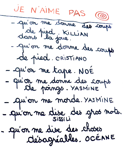 L'après-midi, les élèves des deux classes s'impliquent spontanément dans le dispositif sur la base du volontariat. Les brigades sont facilement repérées par les autres élèves. Les soigneurs portent une couronne de couleur orange sur la tête, les dépollueurs une verte et les médiateurs en herbe une bleue. Le rôle des soigneurs est de veiller au bien-être physique et moral de leurs camarades. Ils sont amenés à gérer des petits bobos, des petites tristesses, par une écoute attentive et quelques mots de consolation qui, très souvent, suffisent. Au besoin, ils accompagnent leur camarade en difficulté auprès des Atsem. Les dépollueurs ont pour mission de veiller à la propreté de la cour en ramassant, par exemple, les papiers tombés au sol ou en balayant les gravillons présents sur le tapis de réception du toboggan. Enfin, les médiateurs en herbe ont pour rôle de repérer toute situation conflictuelle naissant sur la cour de récréation : dispute, accrochage physique ou verbal, pleurs, cris... Leur mission est d'analyser la situation et de faire à leurscamarades des propositions pour sortir du conflit ou passer à d'autres activités. En cas d'échec ou de situation mettant en cause la sécurité des élèves, ils doivent se reporter vers les adultes présents. Comme nous allons le voir, ce dispositif est rendu possible grâce à une préparation pédagogique des élèves dans chacune des deux classes, au moyen de divers moments ritualisés, de jeux communs, d'analyse de situations à partir de photos, activités toujours reliées aux objectifs de l'école maternelle.