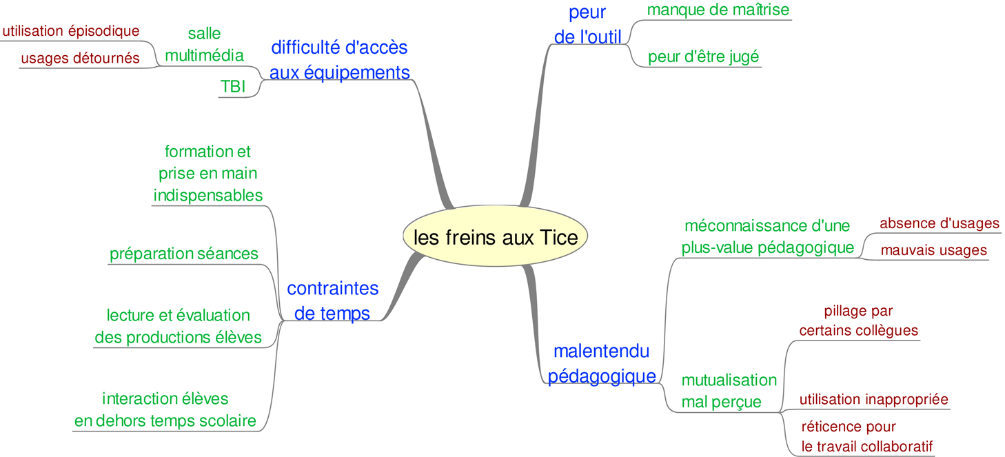 Il ressort que divers facteurs expliquent les réticences actuelles. Les difficultés d'accès aux équipements constituent évidemment un aspect incontournable à prendre en compte, tout comme la peur d'outils de plus en plus nombreux. Le facteur temps peut aussi apparaître comme un frein. Il faut du temps pour apprivoiser l'outil, préparer les séances, rechercher les sources, prendre connaissance des productions des élèves ou répondre aux échanges hors temps scolaire. À ceci s'ajoute un malentendu pédagogique: tous les enseignants ne sont pas convaincus de la plus-value que peuvent apporter les TICE. De plus, le travail collaboratif ne fait pas toujours partie de la culture enseignante, surtout quand certains associent mutualisation à pillage.