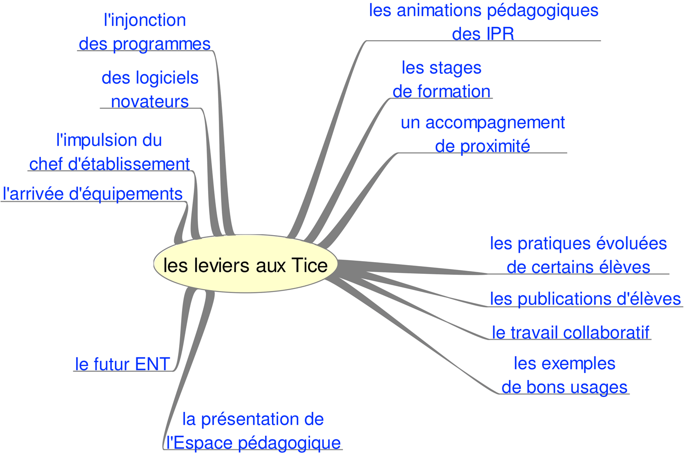 Sur quels leviers (voir ci-dessous) s'appuyer alors pour faire évoluer la situation ? Les programmes sont les premiers incitateurs d'une appropriation des technologies nouvelles. Devenues l'environnement naturel des générations d'aujourd'hui et de demain, il n'y a plus à tergiverser. Il y a aujourd'hui une obligation institutionnelle à faire usage des technologies dans son enseignement. Cette obligation est symbolisée à tous les niveaux d'enseignement par l'existence du B2i et nombre d'inspecteurs indiquent dans leur lettre de rentrée aux enseignants, l'utilisation de l'informatique comme l'un des critères d'évaluation d'une inspection. La formation, tout particulièrement la formation initiale, intègre cette obligation. Les enseignants de SES ont, par exemple, reçu un cédérom qui présentait des logiciels, des outils et des séquences spécifiques à la discipline. Les animations pédagogiques et les stages contribuent fortement à la généralisation de certaines pratiques. L'accompagnement de proximité fait avancer: mutualisations, travail collaboratif entre enseignants, ou pratiques évoluées de certains élèves apportent souvent une aide précieuse. Ainsi, même si les TICE font encore peur à certains, il est incontestable que leur place au sein de l'école grandit de jour en jour. La technique est une chose, son usage en est une autre et le champ à explorer est vaste, aussi bien dans l'aide à apporter pour le développement de l'utilisation des TICE que dans la réflexion didactique concernant l'utilisation pédagogique qui en est faite.