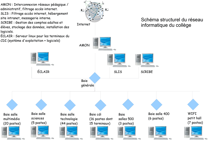 Le parc du collège est d'une centaine de postes. L'espace technologique compte trois salles avec quatorze ordinateurs chacune. Dans une salle "pluridisciplaire", dont le planning est toujours à saturation - la salle dotée par le conseil général - vingt postes sont mis à disposition. Le reste du parc est dispersé: à l'exception d'un professeur de français - Bruno Havard - dont la salle est équipée de six ordinateurs, les autres professeurs disposent, comme en histoire-géographie, d'au moins un poste avec vidéoprojecteur par discipline. Un parc impressionnant, mais beaucoup de ces machines, obsolètes, ne peuvent être utilisées que comme postes-clients légers. Le principe de réalité a imposé une configuration où tous les postes sont en réseau avec trois serveurs pour la partie pédagogique, dont un suffisamment "costaud" pour intégrer tous les logiciels. La maintenance doit être régulière comme la mise à jour des logiciels et la gestion du réseau : c'est beaucoup de temps pour les deux enseignants qui se chargent de ce travail, mais cela a permis de "récupérer" de "vieilles" machines du lycée, plus viables telles quelles, mais tout à fait utilisables moyennant ce dispositif. Cette configuration consiste en l'installation d'un serveur de type Éole Éclair et des postes appelés "clients légers" qui peuvent être dépourvus de disque dur et de lecteur de cédérom. Ces terminaux sont connectés au serveur et affichent le système d'exploitation et les applications qui y sont installés. Ce fonctionnement est probablement la solution aux problèmes technique et économique que soulèvent les TICE en collège comme en primaire (voir ci-dessous). Bien sûr, en technologie et en arts plastiques, enseignants et élèves peuvent utiliser des ordinateurs plus performants, notamment pour la modélisation en trois dimensions ou la retouche d'images.