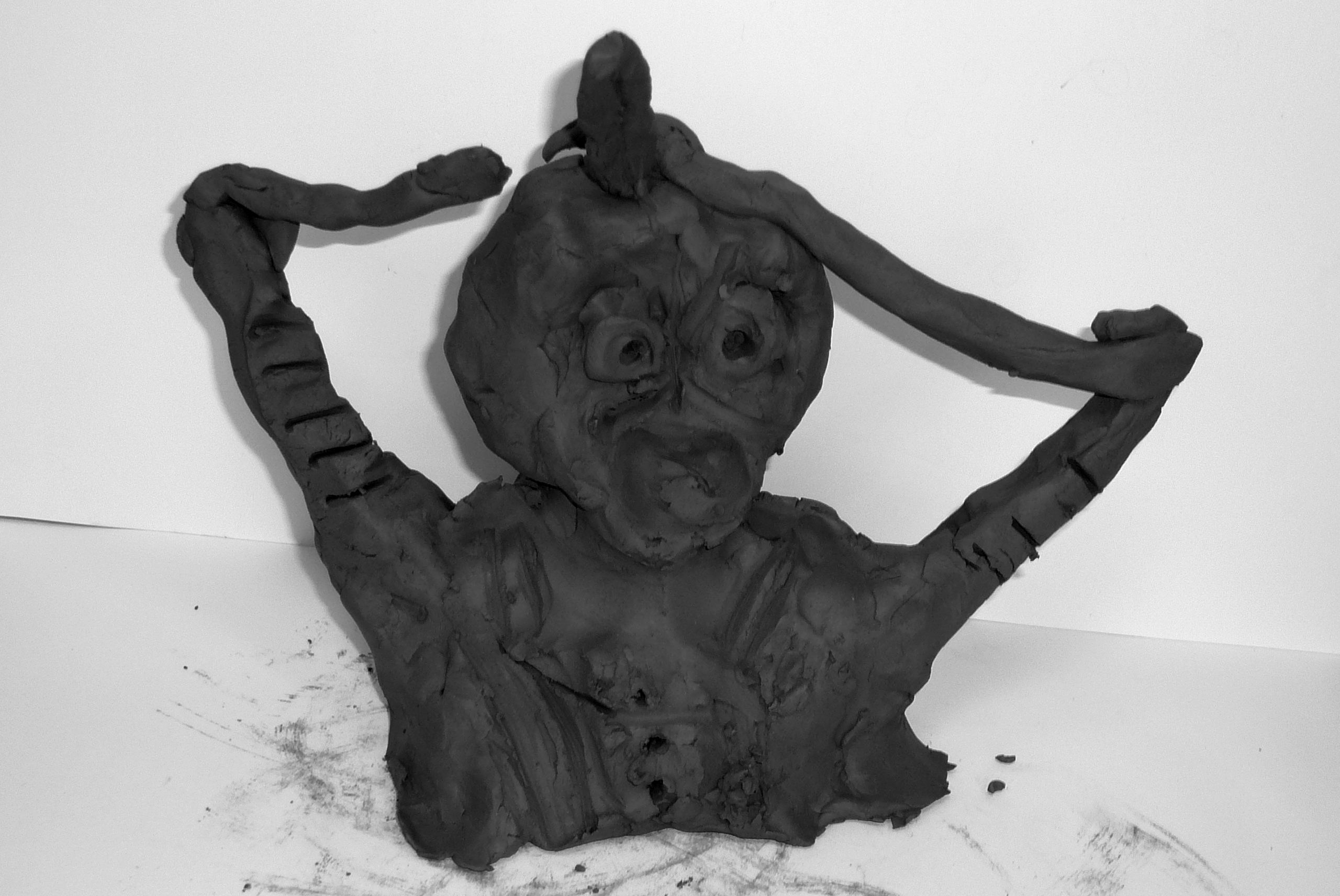Dans les deux classes de Claudie Hellegouarc'h et de Catherine Jaunait, ce sont des gargouilles qui ont retenu toute l'attention des élèves de CP. Lors d'une sortie pour visiter le village, une chapelle un peu à l'écart du bourg, la chapelle de Bethléem, a marqué l'imaginaire des élèves. Ils ont découvert des gargouilles, les ont commentées et ont eu envie d'en créer. Mais ils ont aussi compris en parlant avec l'artiste Sofie Vinet, que ces gargouilles, comme bien d'autres choses, étaient souvent invisibles aux yeux des habitants qui ne voient plus ce qui les entoure. Ils ont donc décidé de redonner une seconde vie, en quelque sorte, à ces œuvres datées, pour certaines, du Moyen Âge, en attirant l'attention des passants. Les élèves ont créé un trajet balisé de l'école à la chapelle pour inciter à la promenade. Création d'empreintes avec des compositions végétales dans la partie boisée, empreintes de pieds et de mains peintes sur le bitume, signes et dessins à la craie sur bancs ou palissades... Plusieurs allers-retours entre l'école et la chapelle ont eu lieu afin de réaliser cela. À la fin de ce premier travail, pour donner encore davantage de lui-même à ces lieux, chaque élève a apporté un de ses objets favoris et l'a placé là où il le souhaitait. Des prises de vues des empreintes et des objets ont été faites par l'artiste. Parallèlement, en classe, les élèves créaient chacun leur gargouille. À partir des échanges oraux au retour des sorties, chacun a élaboré son personnage et a testé son effet avec des ombres au sol. Réalisées d'abord en papier découpé, ces gargouilles ont eu droit, elles aussi, à une sortie pour des essais sur site, puis elles ont été modelées en terre et ont fini par constituer un drôle de bestiaire.
