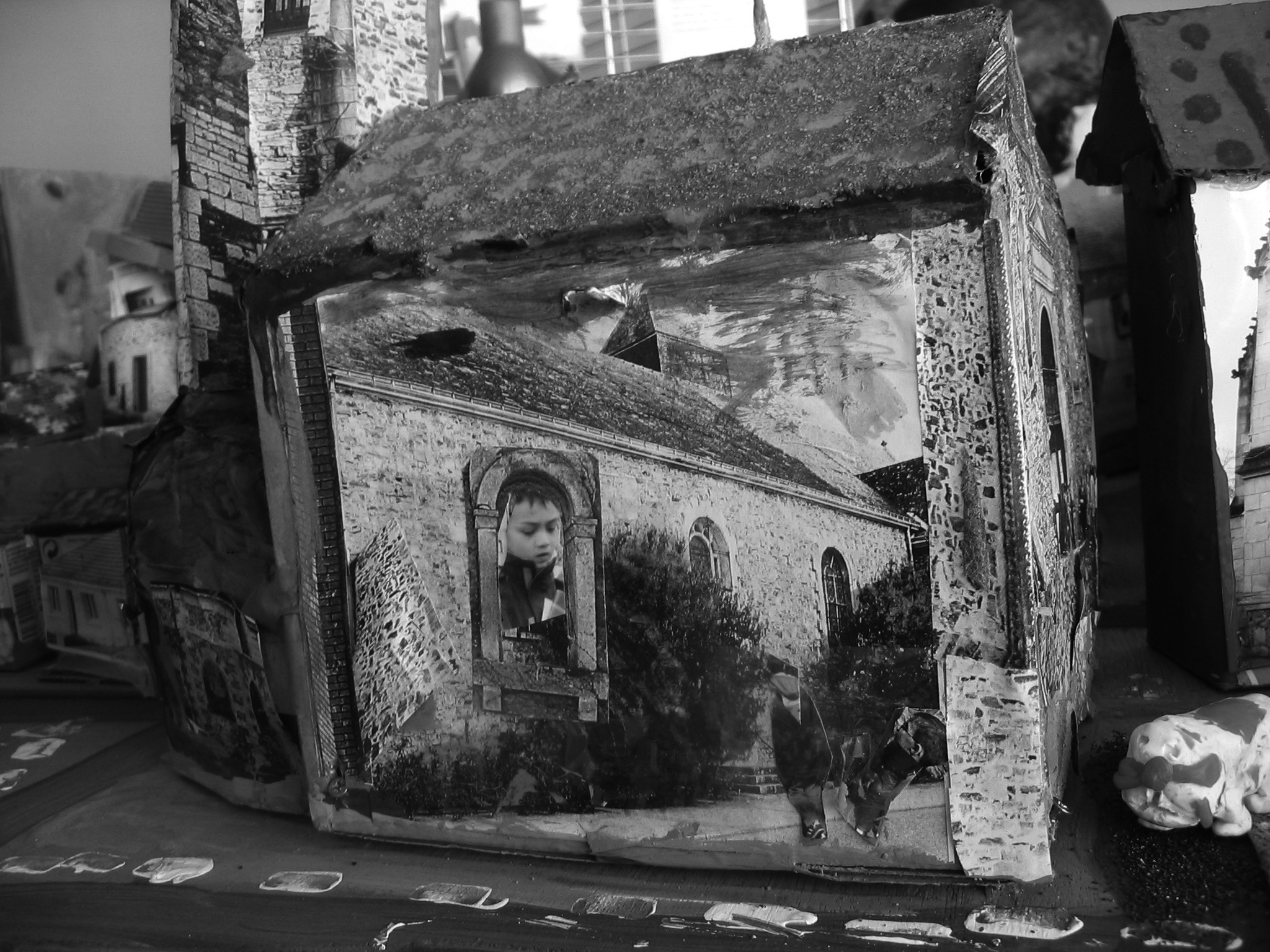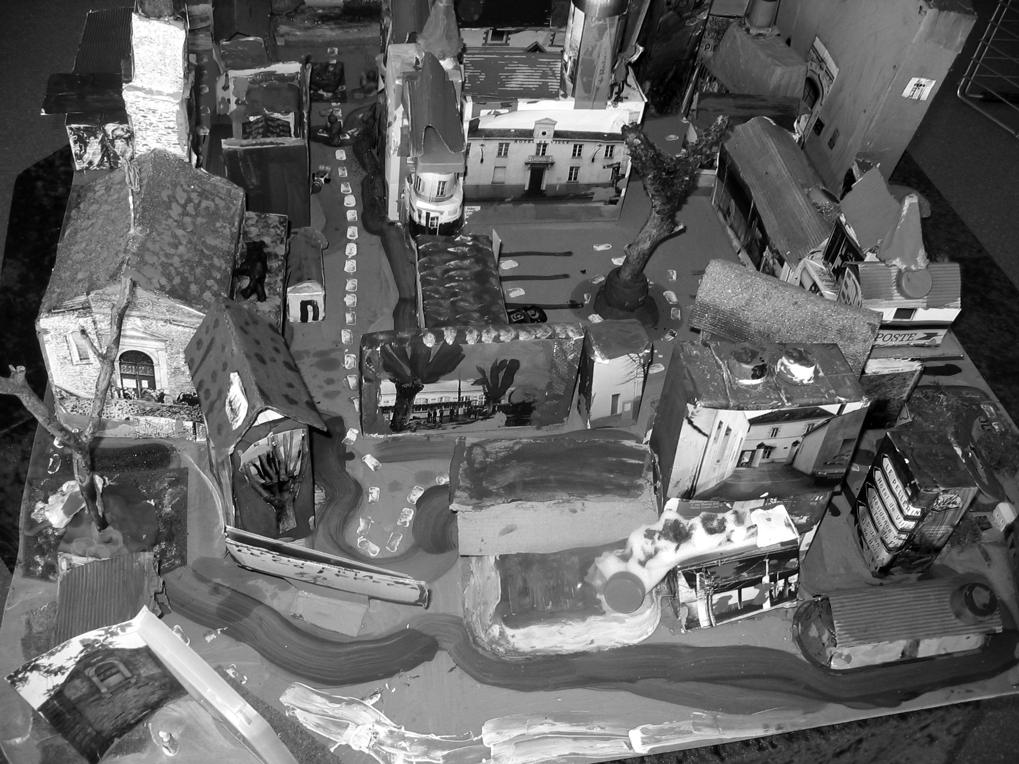 Puis en avril, une semaine banalisée a été organisée pendant laquelle toutes les classes se sont lancées dans les créations plastiques ou culturelles avec les artistes. Les temps d'intervention de ces derniers ont été variables, surtout pour Odile Kayser qui coordonnait l'ensemble et apportait son aide un peu à toutes les classes. Évidemment, le niveau des classes a joué dans le choix des créations, mais la façon dont l'artiste attitré à la classe pose son regard sur le monde a aussi été source d'influence. Et là encore, ce n'est pas seulement cela car les enseignants aussi ont enrichi ce travail : eux-mêmes ont une vision de l'espace qui leur est propre. Ainsi dans la classe de CE1, le travail prévu avec la plasticienne Odile Kayser était un travail à plat de collages et de peintures, mais les réactions des élèves et de Joëlle Barthélemy, l'enseignante, ont conduit l'artiste à travailler en volume pour finalement aboutir à une maquette du village. De la même façon pour la classe de CM2, l'enseignant, très féru de l'outil informatique, a fait travailler ses élèves sur Géoportail et cet apport technologique a orienté les choix artistiques. Après cette semaine banalisée, les productions ont été finalisées dans chaque classe, à raison de plusieurs séances jusqu'en juin, moment de l'exposition. Les enseignants ont donc travaillé seuls avec leurs élèves, avant, pendant et après les interventions des artistes, mais sous leur houlette.