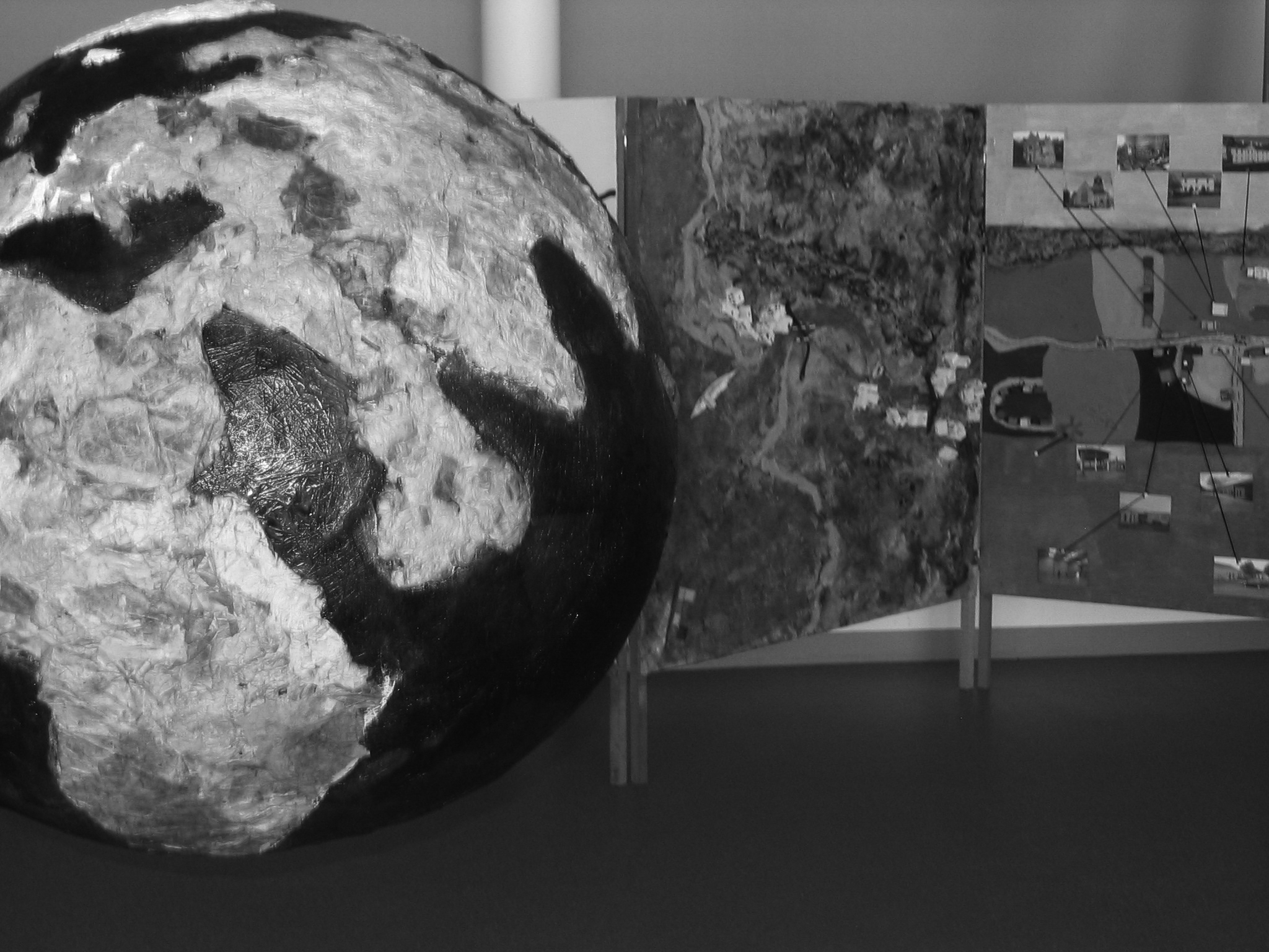 Changement de focale pour le cours mixte de CE2/CM1 d'Olivier Giron dont les élèves ont choisi de faire des recherches afin de pouvoir situer leur commune sur une représentation de la planète. Le questionnement de la classe s'est inscrit dans une tout autre démarche que les autres: les élèves voulaient se positionner par rapport à la Terre. La réalisation d'une mappemonde avec l'artiste Odile Kayser ne s'est pas faite sans mal! Sur un ballon gonflé et recouvert de papier kraft collé, les élèves pensaient pouvoir peindre, mais à deux reprises, le ballon a éclaté ! Heureusement, l'artiste a pu sauver la classe en fabriquant elle-même un ballon en résine. La première épreuve technique était passée, restait un travail encore très difficile: tracer à la craie les continents et les mers avant de leur donner reliefs et couleurs. Les échanges oraux, les recherches documentaires et la réalisation manuelle de la mappemonde géante ont permis aux élèves de se représenter la planète, de réaliser où ils se situaient dans cette immensité et également d'apprendre à dépasser des difficultés. Du point de vue géographique, c'était aussi un travail d'appropriation des termes spécifiques car l'œuvre devait montrer les différentes zones désertiques, rocheuses, boisées...