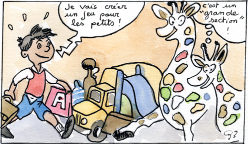Cette mise en place libère l’enseignante qui peut observer, écouter les échanges : le réinvestissement du vocabulaire de la ville, la construction des phrases, la place de chacun, le jeu de questions-réponses pour élaborer une stratégie. Comment renouveler cette activité pour amener les élèves à enrichir leurs échanges ? En proposant une nouvelle forme du jeu, cette fois à l’échelle de la cour. Durant les "24 heures de la maternelle", les parents ont été mis à contribution ; ils ont fait des propositions étudiées ensuite par les enseignantes. Pour adapter le jeu en format géant, l’utilisation de brouettes, de landaus, de chariots, mais aussi celle du marquage au sol et des installations (toboggan, camion…) sont envisagées. Une manière innovante de reconduire autrement cette activité ludique avec des objectifs de langage à chaque fois un cran plus ambitieux. Il s’agit ici de développer les échanges et donc d’allonger le temps de parole. "Pour s’approprier les savoirs, il faut changer de contexte et agir selon ses objectifs propres, qui sont ici orientés vers une coopération, explique É. Fleurat. En passant dans la cour, le matériel mis à disposition des élèves sera nécessairement plus volumineux. Or, la manipulation de grands objets nécessite plus de coopération, il faut trouver des solutions. Il s’agit là de réussir à résoudre une situation-problème à plusieurs."