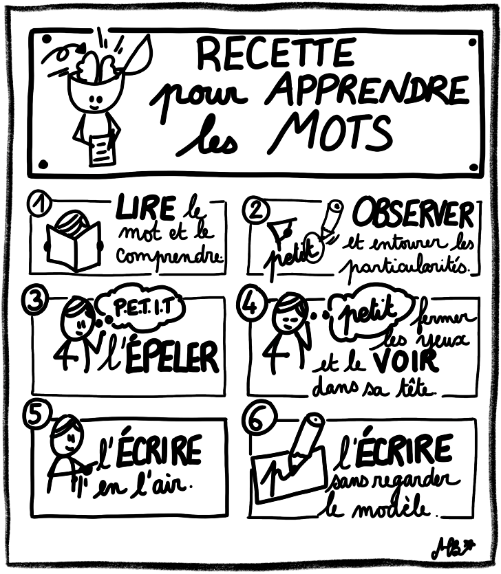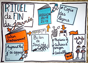 "Recette pour apprendre les mots", "rituel de fin de journée" pour exemples : uniques, créatifs et dynamiques, les affichages de la salle de classe de Manuella Chainot-Bataille sont sketchnotés. Le choix des couleurs ou du noir et blanc, les typographies utilisées, l’organisation de l’espace du document : ces supports à l’esthétique soignée accrochent le regard. "Ce n’est pas de l’art, précise aussitôt l’enseignante, le sketchnoteur vise à transmettre des idées le plus clairement possible". Cette stratégie de prises de notes est peu courante à l’école. Le graphiste et illustrateur Mike Rohde1 explique qu’elle est fondée sur un alphabet visuel composé de formes et de zones. "Le terme sketch signifie croquis ou ébauche en anglais et noting le fait de prendre des notes de façon dynamique"2 en utilisant différentes typographies, en réfléchissant à l’espace de la page, en intégrant des images simples et des couleurs. "C’est une technique visuelle qui s’apprend et que l’on développe ensuite en pratiquant, poursuit la professeure, elle n’est absolument pas réservée aux personnes douées pour le dessin". Enseignante expérimentée, Manuella Chainot-Bataille a découvert cette technique lors d’un atelier d’initiation qu’elle a suivi dans un cadre associatif3 en 2016. C’est un outil individuel qui peut devenir un outil d’échange à condition de restituer très clairement le sens. Grâce à l’appropriation d’outils visuels, le sketchnoting vise à rendre compte d’une réflexion : il s’agit d’organiser et de synthétiser des idées en créant un support attractif.